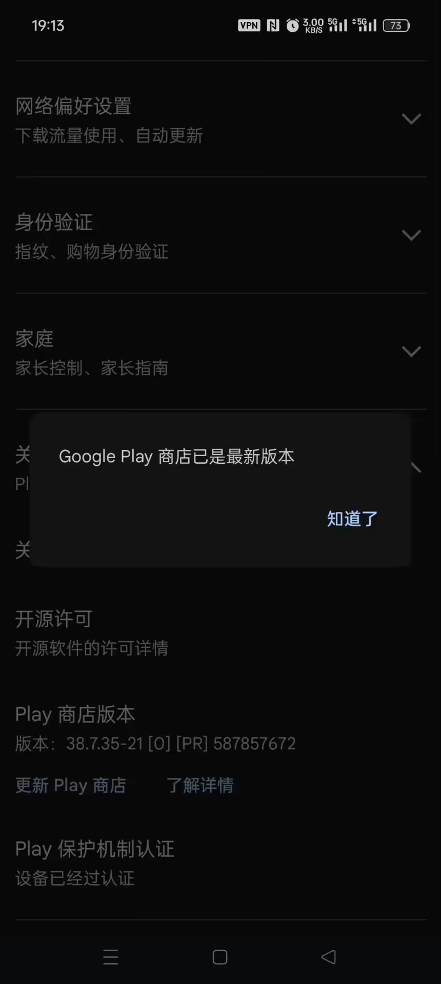 该弹窗是在点击按钮后立即弹出的,似乎没有产生网络活动。最初使用的是系统内置的Google Play 商店,怀疑可能去除了更新功能。但在TechSpot下载并安装了新版后,发现问题仍然存在。而在Google Play 商店更新之后的一段时间内,Google Play 服务也会随之更新。同时网络也没有任何问题。因此排除了应用本身的问题。